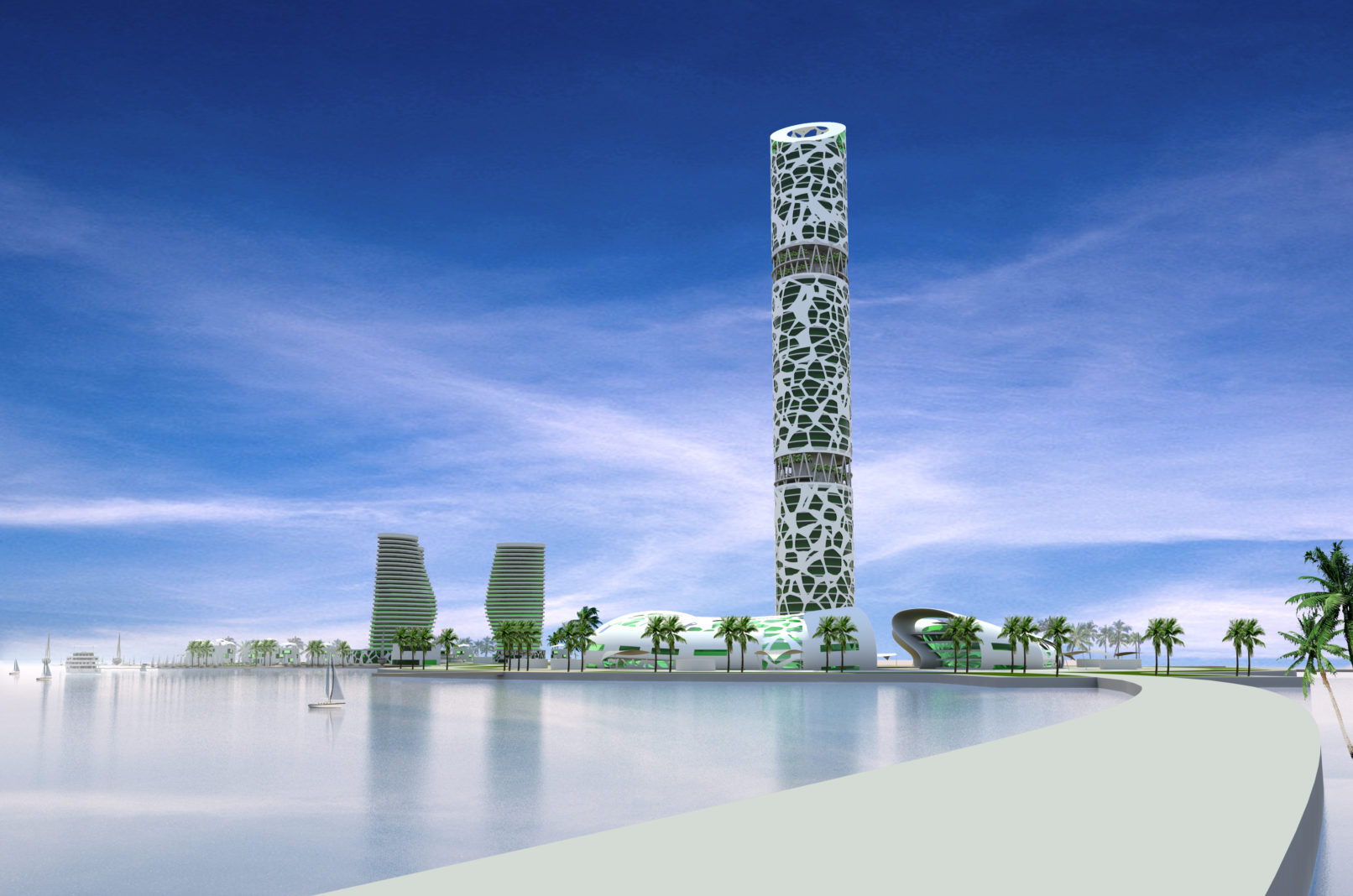 Der Entwurf betont die zwei unterschiedlichen Zentren der neu geplanten Insel – den Gewerbeteil und den Wohnbereich. Das Geschäftszentrum umfasst einen 260 m hohen Hotel-Büroturm und ein mit Einzelhandelsgeschäften aktiviertes kommerzielles Podium, das zum neuen Wahrzeichen der Bucht von Haikou werden soll.