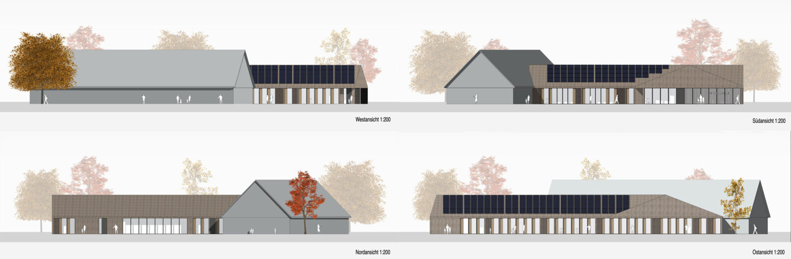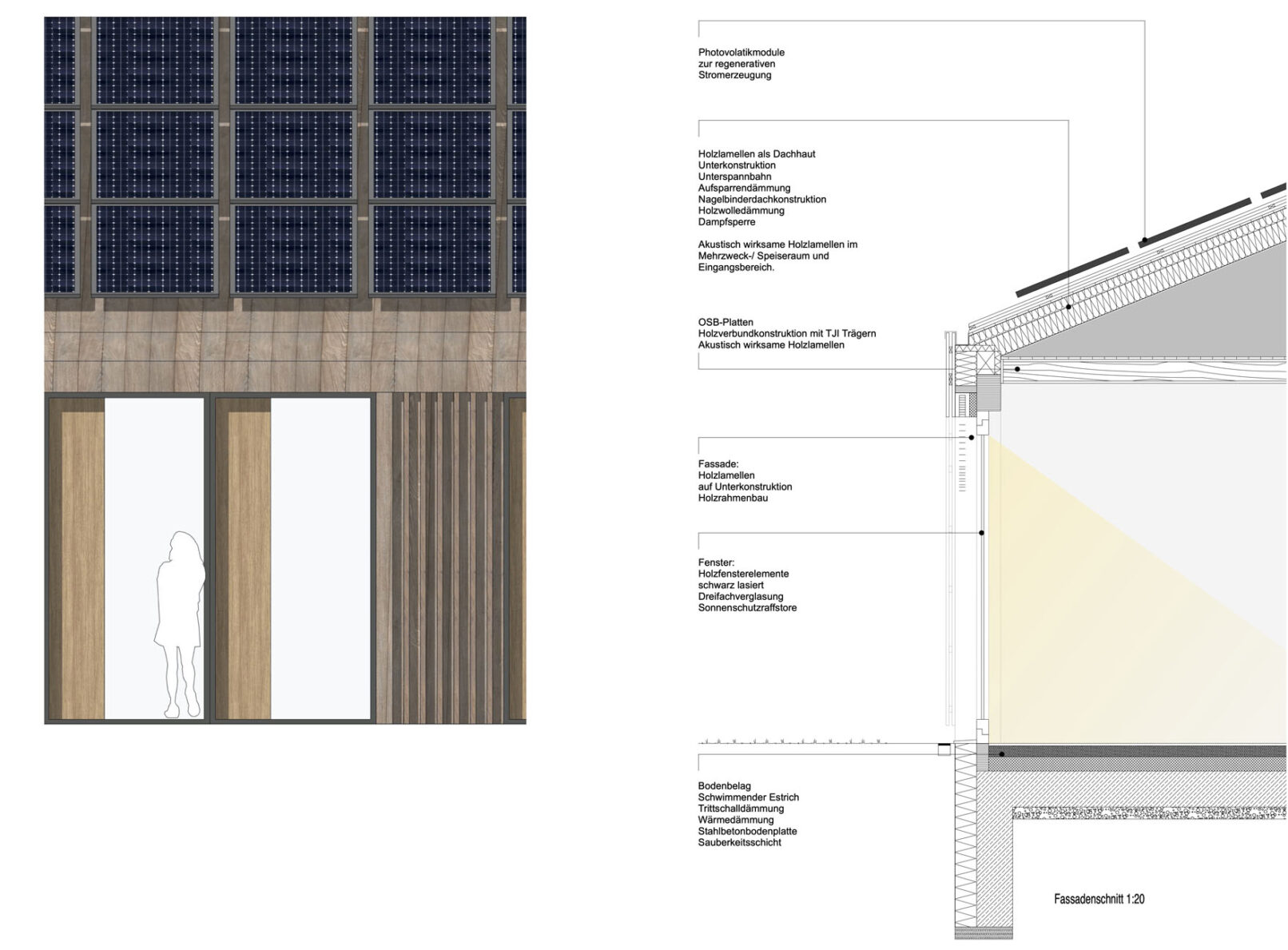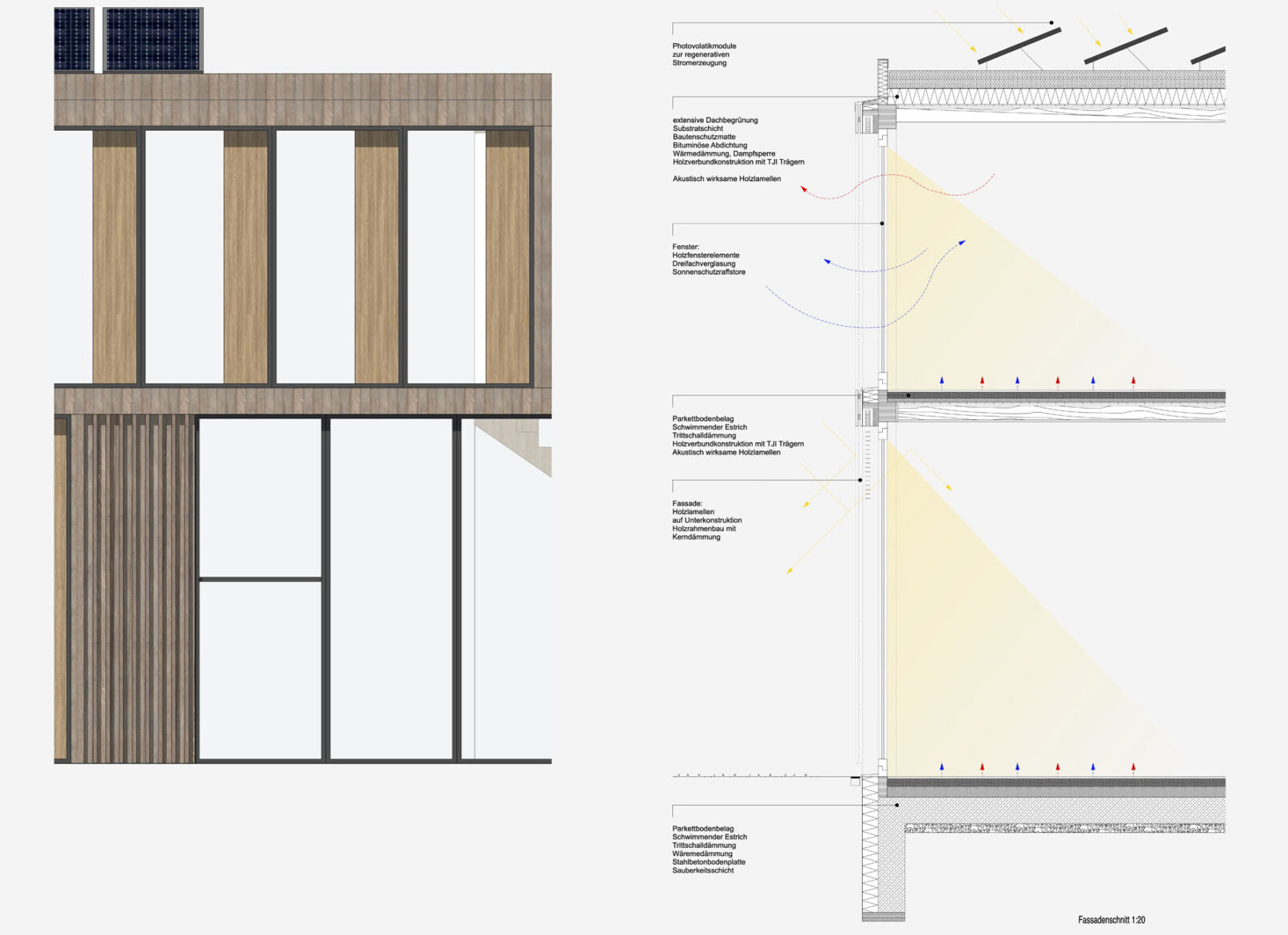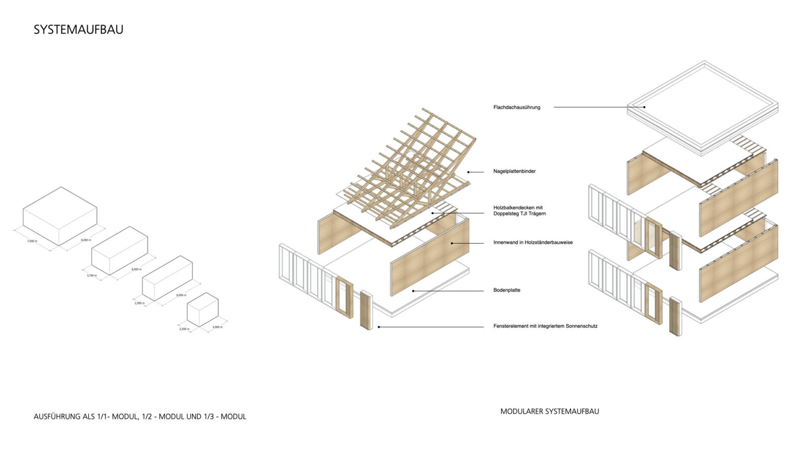 Unser Konzept reagiert darauf und mit einem nachhaltigen und modularen System, welches flexibel an die unterschiedlichen Gegebenheiten des jeweiligen Gebäudestandorts angepasst werden kann. Gefordert waren möglichst innovative und modellhafte Gebäude, die unter anderem Aspekte der Nachhaltigkeit, Ökologie und Modularität erörtern.