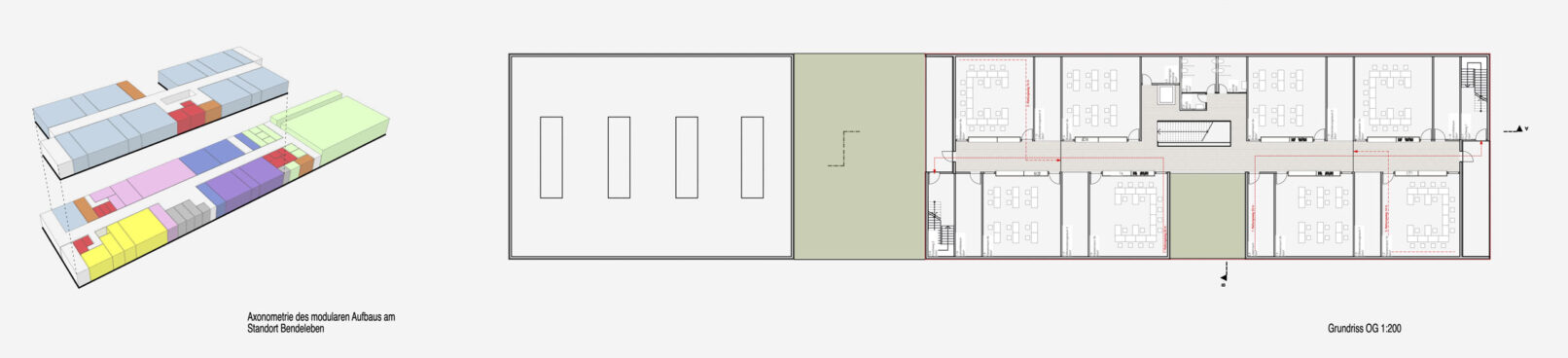 Eine ressourcenschonende und standardisierte Bauweise verbindet zudem wirtschaftliche Vorteile mit einem hohen Vorfertigungsgrad, über die sich signifikant verkürzte Bauzeiten realisieren lassen. Als Grundlage dient ein modulares Grundsystem von 7.5m x 8.0m (Innenraummaß), welches bedarfsweise auch als Halbmodul, Drittelmodul oder noch kleiner ausgeführt werden kann. Damit lässt sich der Großteil aller notwendigen Räume realisieren.