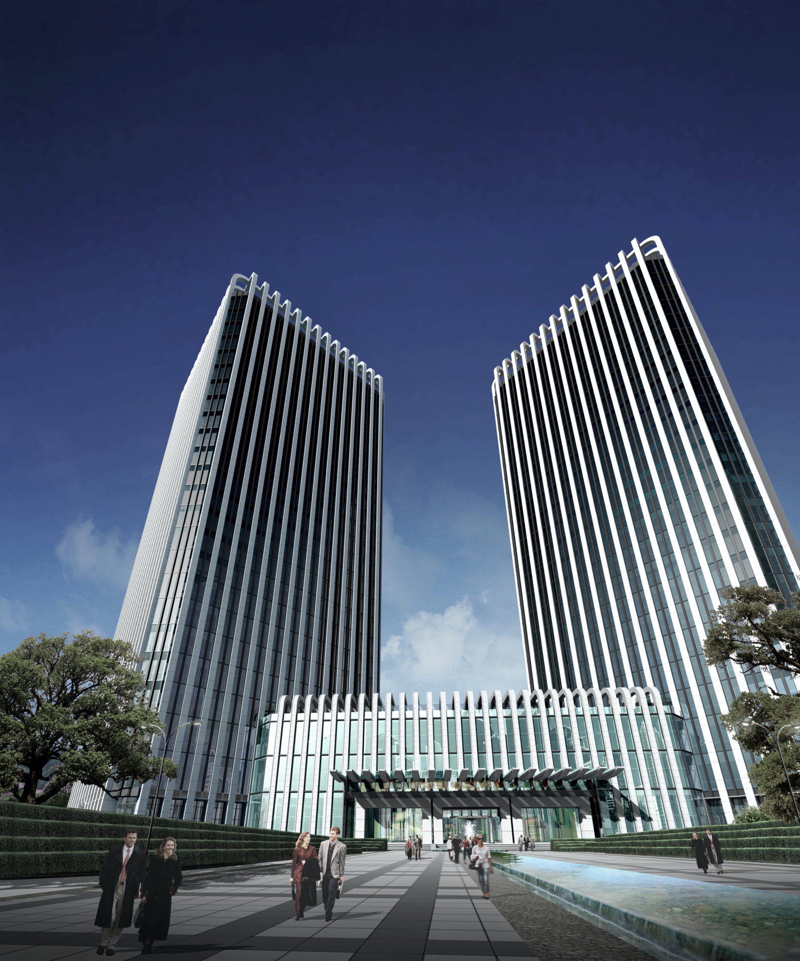 Das Grundstück des knapp über 100.000 m² großen Komplexes liegt im Bezirk Baoshan, Shanghai, an einer Hochbahntrasse. Neben der Optimierung der einzelnen Büroflächen und einer energieeffizienten Gestaltung, war daher ein wichtiges Planungsziel die Reduzierung der Lärmbelästigung durch vorbeifahrende S-Bahn-Züge. Die Lösung bestand darin, die Ausrichtung des Gebäudes in einem 45-Grad-Winkel zu ändern und beide Bürotürme gegenüber den Bahngleisen zu positionieren. Außerdem wurde die Verglasung des Vorhangfassadensystems auf der Rückseite des Büroturms minimiert.