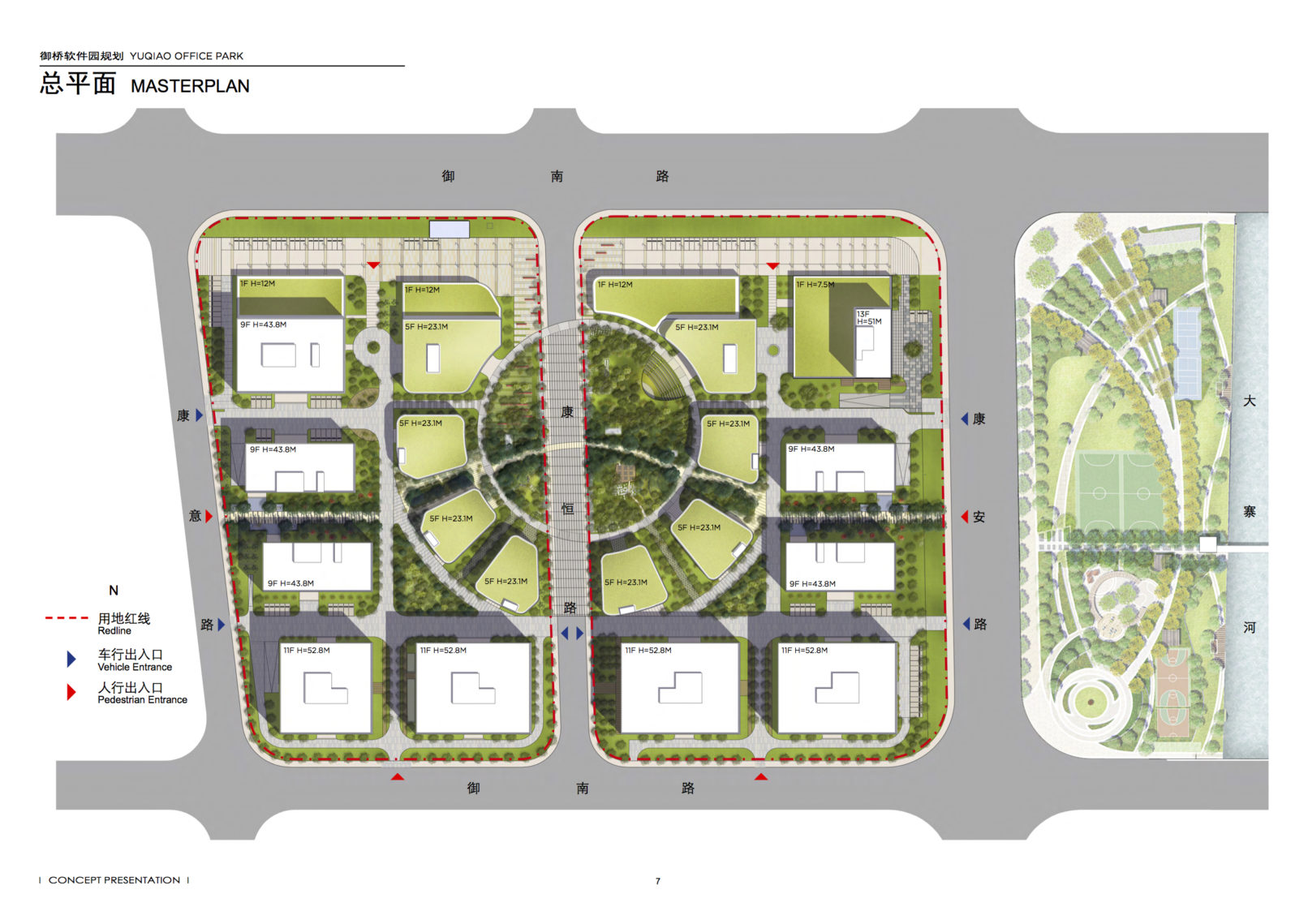 Nach der erfolgreichen Genehmigung des durch uns entwickelten Yujiao-Masterplans wurden wir mit der Planung zwei weiterer Grundstücke beauftragt. Um ein möglichst grosses Spektrum an zukünftigen Nutzern anzusprechen, entwickelten wir eine S-M-L-XL-Strategie, die eine hohe Flexibilität für potentielle Mieter bietet. Die Bürotürme gruppieren sich dabei entlang der jeweiligen Grundstücksperimeter und ergänzen die bestehenden urbanen Blocktypologien. Ein zweiter Ring kleinerer Bürogebäude gruppiert sich um einen großzügigen zentralen Gartenbereich. Jedem Büroarbeitsplatz wird so die Möglichkeit geboten, innerhalb von 3 min. Zugang zu einer Grünfläche zu erhalten. Zusätzlich werden mehrschichtige, vertikale Fassadenbegrünungen als "Living walls" integriert. Dadurch entsteht eine nahezu entmaterialisierte Bürotypologie, die die Natur nicht nur zum integralen Bestandteil des Gebäudes selbst macht, sondern die Grenze zwischen Außen- und Innenräumen verwischt.